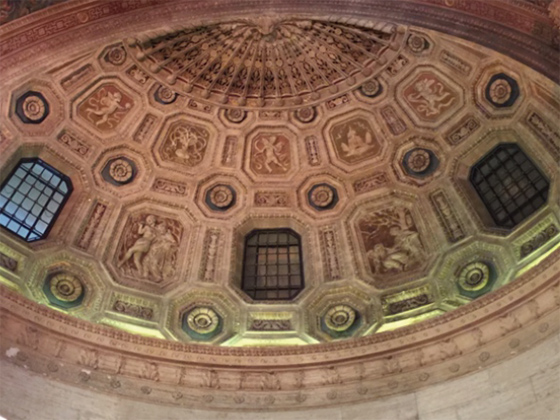 «Итальянскими» выглядят и полихромные стукки в лобби, и темы всех муралей, и пол из итальянского травертина, перемежающегося полосами мрамора и мраморными мозаиками. Потолки работы мастеров Винтера и приехавшего из Италии Веджецци представляют собой коллаж из церковных и дворцовых мотивов, прототипы отыскиваются в центральной Италии в шестнадцатом веке. А еще в более выраженном виде прототипы этих фигур отыскиваются и в той же Италии в двадцатом. Вот ниже — фигура с «Дома фашистов» в Вальданьо, в Венето.