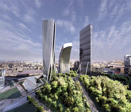 Небоскреб, как гриб, любит вырастать там, где прежде располагались луна-парк или Всемирная выставка. По инерции? По привычке, там, где стояло нечто высокое, скайлайновое? Вот и сегодня в Милане с помпой строят новый район небоскребов «Ситилайф» на месте выставки 1906 года, в свое время посвящавшейся открытию Симплонского туннеля между Италией и Францией; на территории этой выставки целый век продолжала потом работать выставка достижений хозяйства (Fiera Campionaria). Только в 2005 году, начав готовиться к всемирной ЭКСПО, традиционную ежегодную выставку-ярмарку переместили в новый комплекс Перо-Ро. Тем самым был выведен хаотический трафик из центра Милана и освободилась площадка в центре города. И сразу же было решено водрузить там три смешных небоскреба, спроектированных тремя звездами-архитекторами: недавно умершей Захой Хадид («Косой»), Даниэлем Либескиндом («Кривой») и Аратой Изоцаки («Ровный»). Пока что построили только «Ровный», остальные запаздывают.
