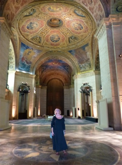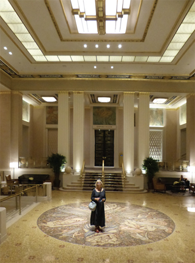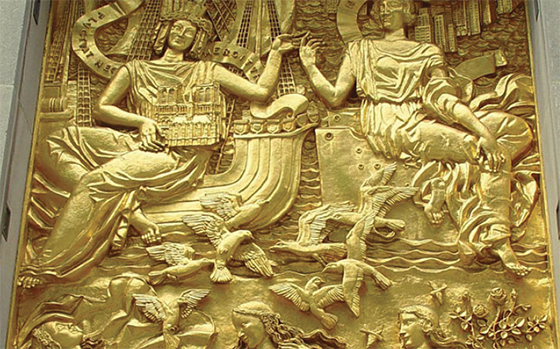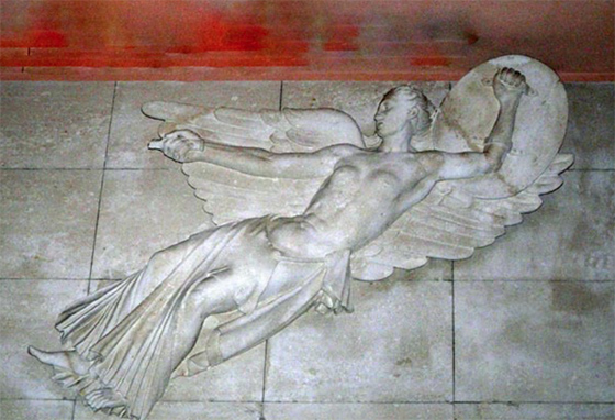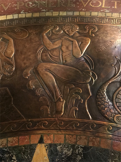 А это часть чеканного обруча работы Джона Грегори, окружающего мраморную розу ветров на полу в лобби Cunard Building в Нижнем Манхэттене. На фрагменте показана одна из шестнадцати морских фигур обруча, нимфа Аретуза, превращенная в источник. Вообще же на обруче изображено путешествие Энея из Трои в Италию, и вся композиция окольцована горациевой строкой — прощанием с отплывающим Вергилием. Тема мореплавания, тема Средиземноморья и, в частности, Италии, Рима важна для этого здания, потому что дом был построен для крупнейшей фирмы морских перевозок.