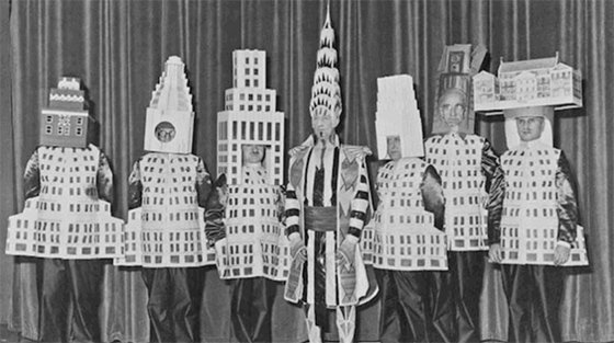 С самого времени рождения небоскребы преподносились (да и до сих пор нередко преподносятся — достаточно поглядеть на самые последние стройплощадки!) как игровые предложения, трюки, развлечения, игрушки. Игровую атмосферу сохранили и передают снимки бала, состоявшегося 23 января 1931 г. в отеле «Астор» на Бродвее, где архитекторы преобразили свои творения в собственные костюмы для карнавала. Фотографии неоднократно публиковались и перепубликовывались. Достаточно набрать в интернете «Бал архитекторов».