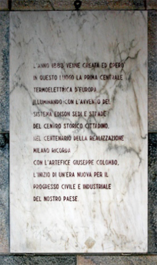 Волна обновления докатилась через океан и до моего Милана. Мало кто из прохожих замечает настенную доску на улице Санта-Радегонда: Милан — первый город континентальной Европы, где появилась электростанция (в Лондоне на год раньше). Ректор Миланского политехнического института Джузеппе Коломбо ровно-таки в 1882 году работал в Нью-Йорке с Эдисоном и присутствовал 4 сентября при судьбоносном запуске первой нью-йоркской электростанции на Перл-стрит. Вернулся в Италию, запустил в следующем году такую же электростанцию на улице Санта-Радегонда в Милане. Рядом с Дуомо. Главной турбине присвоили имя Джамбо — любимого слона из цирка Барнума.