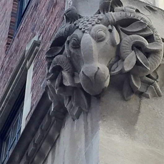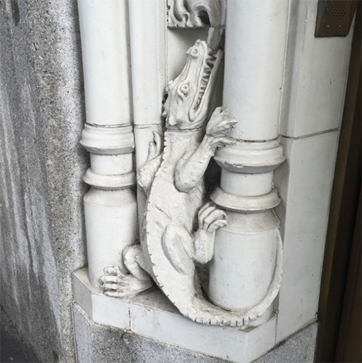 Сколько же знакомых по Европе потешных деталей смотрит на нас со стен зданий Нью-Йорка. Черти, мартышки, свиньи, крокодилы, бараны, драконы. Отчасти объяснений и не требуется. В Европе в первой половине двадцатого века нередко строились любителями путешествий дома по мотивам собственных колониальных странствий, где европейские туристы не могли налюбоваться крокодилами, мартышками и многочисленными змеями (таковы миланский Аквариум, киевский «обезьянник» Городецкого, а в Нью-Йорке, фото ниже, — дом на углу улиц Либерти и Нассау).