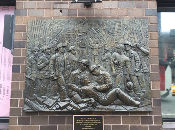 Нью-Йорк до того любит свой стиль «ностальгии по утраченному референту» (Ж. Бодрийяр), он так привык к декорациям в стиле европейского монументализма тридцатых, что и новосозданные рельефы выполняются похожим способом. Вот на Восьмой авеню на здании пожарного отделения барельеф, посвященный пожарным, отдавшим свои жизни 11 сентября 2001 года, отчеканенный, как видим, в той же виньеточной линеарности, что и аллегории стран на Рокфеллер-центре или аллегории муз.
