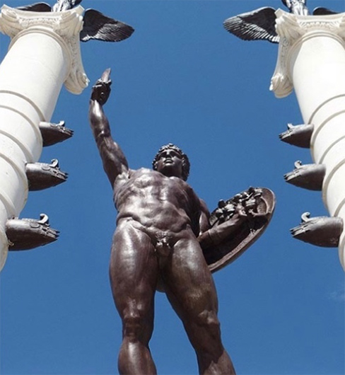 Прототипы этого памятника — на древнеримском Форуме. Победив врагов, римляне отрезали носы вражьих кораблей. В качестве трофеев. У ростров было и практическое применение, у этих люлек. Их использовали как фигуры для публичных выступлений (прообраз броневика…)