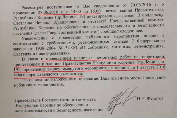 28 июня организаторам (заявления пишут члены инициативной группы) отказали в пикете возле здания правительства республики «в связи с проведением плановых ремонтных работы на территории, прилегающей к зданию правительства республики Карелия».