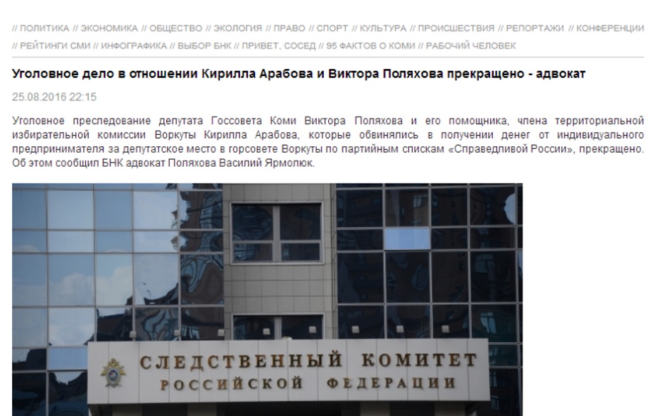 25 августа информационное агентство «БНК» опубликовало заметку, в которой говорилось, что уголовное дело в отношении депутата Госсовета Коми Виктора Поляхова и его помощника, члена территориальной избирательной комиссии Воркуты Кирилла Арабова прекращено. Автор статьи ссылался на адвоката Поляхова Василия Ярмолюка. Через некоторое время текст был удален с сайта информационного агентства, но остался в кэше гугла. Его также перепечатал портал «Заполярка-онлайн».