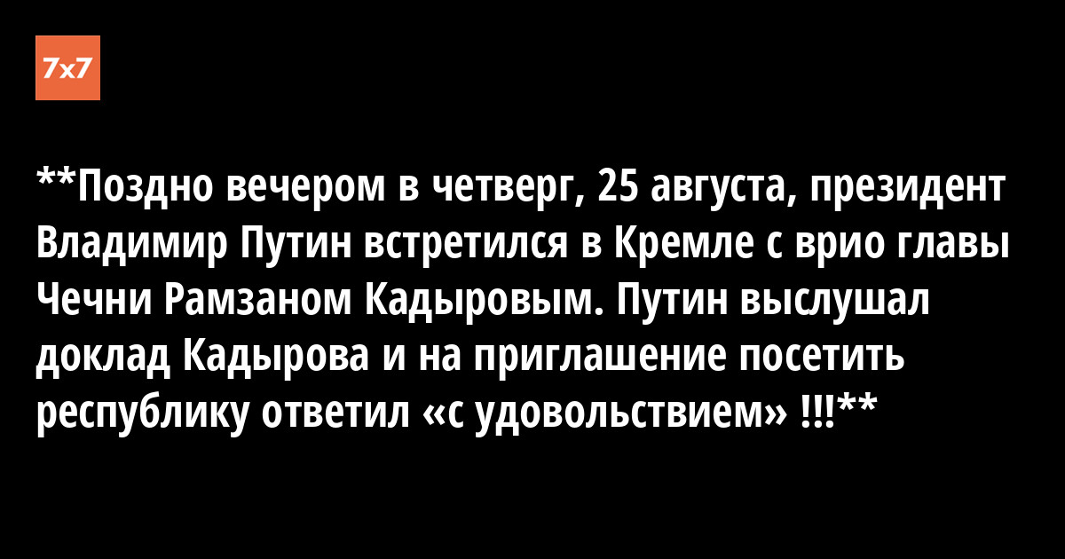 **Поздно вечером в четверг, 25 августа, президент Владимир Путин встретился в Кремле с врио главы Чечни Рамзаном Кадыровым. Путин выслушал доклад Кадырова и на приглашение посетить республику ответил «с удовольствием» !!!**