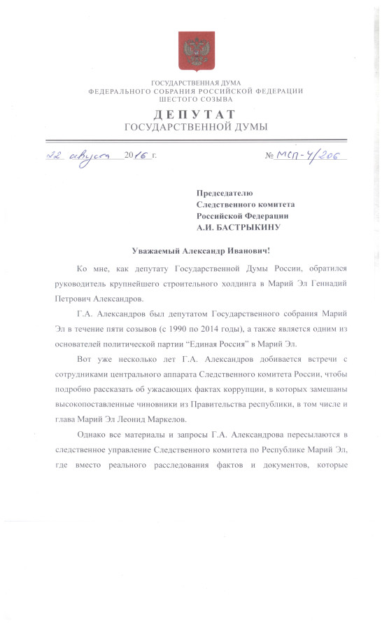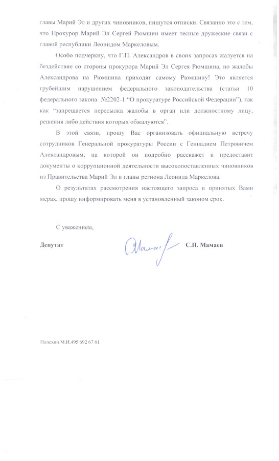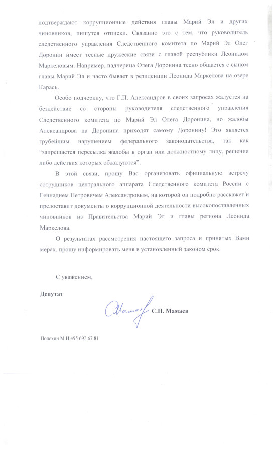 Депутат Госдумы Сергей Мамаев просит организовать официальную встречу сотрудников Генеральной прокуратуры и Следственного комитета России с руководителем «Маригражданстрой» Г.П. Александровым