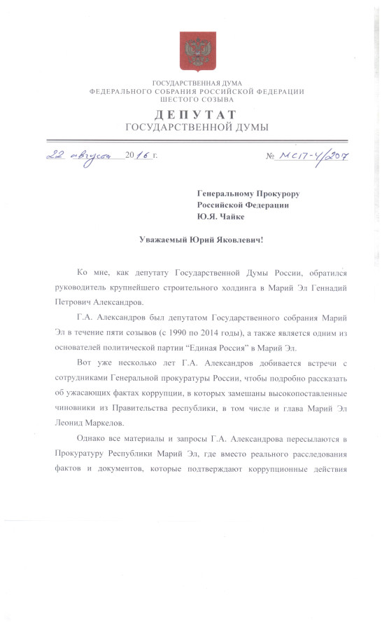 Вот уже несколько лет Г.А. Александров добивается встречи с сотрудниками Генеральной прокуратуры и Следственного комитета России, чтобы подробно рассказать об ужасающих фактах коррупции, в которых замешаны высокопоставленные чиновники из Правительства республики, в том числе и глава Марий Эл Леонид Маркелов.