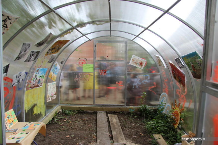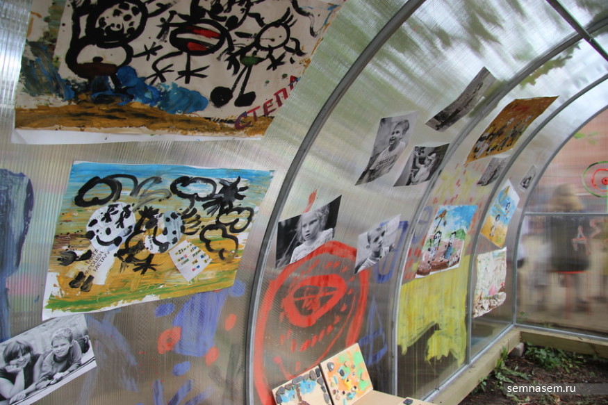 Этот уголок за три летних месяца стал неузнаваемым. Из серого, никому не нужного, поросшего бурьяном куска земли, он стал именно таким, чтобы без преувеличения именоваться садом. Здесь пока не цветут груши или яблони, зато в середине установлена настоящая сцена, рядом — огромная теплица, по краям высажены цветы, стены пестрят яркими рисунками, а под ногами уже не сухие листья с травой и непроходимые кусты, а чистая полянка с зеленой травой. Все это сделали своими руками родители детей-аутистов, которые занимаются в творческой студии Натальи Никулиной.