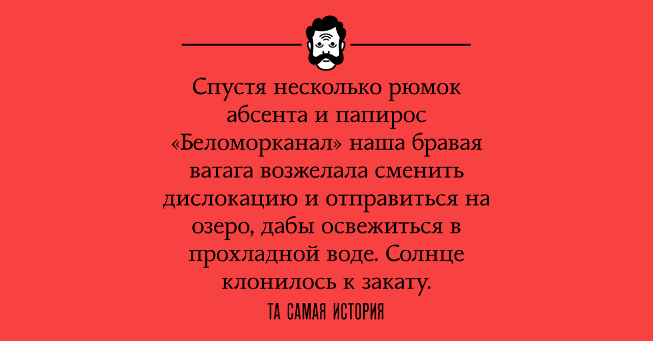 Добравшись до места назначения и пройдя через КПП (стоит уточнить, что резиденция Андрея, которая и была целью нашей поездки, находилась в военном городке, окружённом бетонным забором и охраняемом бабушкой «божьим одуванчиком» в режиме 24/7), мы приступили к осмотру окрестностей и, не сочтя их достаточно интересными, принялись за абсент. Спустя несколько рюмок и папирос «Беломорканал», наша бравая ватага возжелала сменить дислокацию и отправиться на озеро, дабы освежиться в прохладной воде. Солнце клонилось к закату, поэтому мы решили не тратить время на формальности и перелезли через забор, минуя КПП.