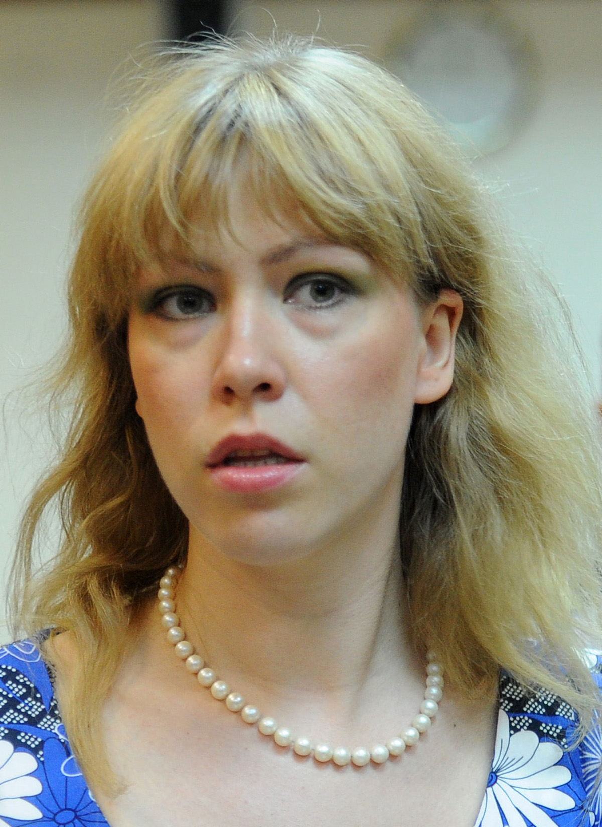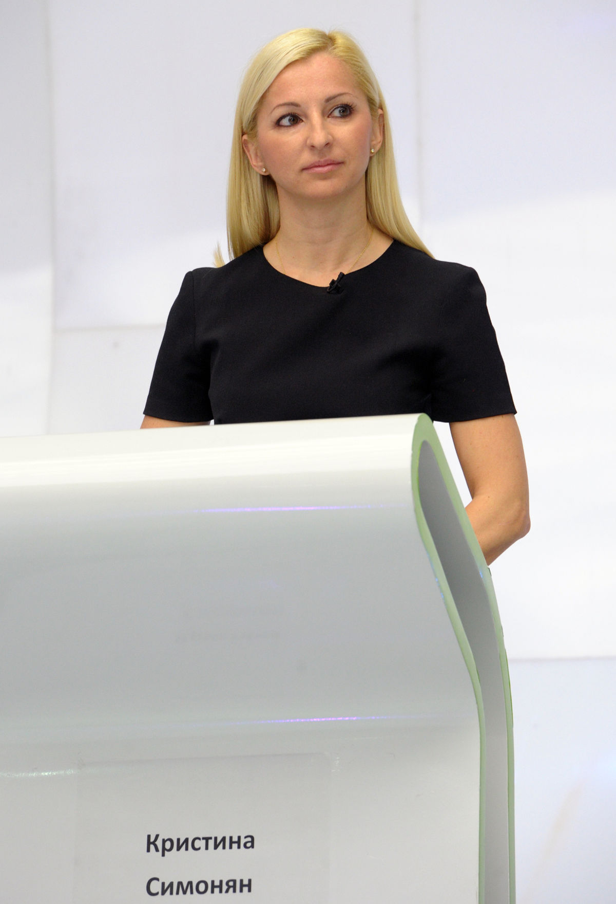 В облегающем красном платье, в туфлях на шпильках молодая блондинка с улыбкой дает интервью под телекамеры.