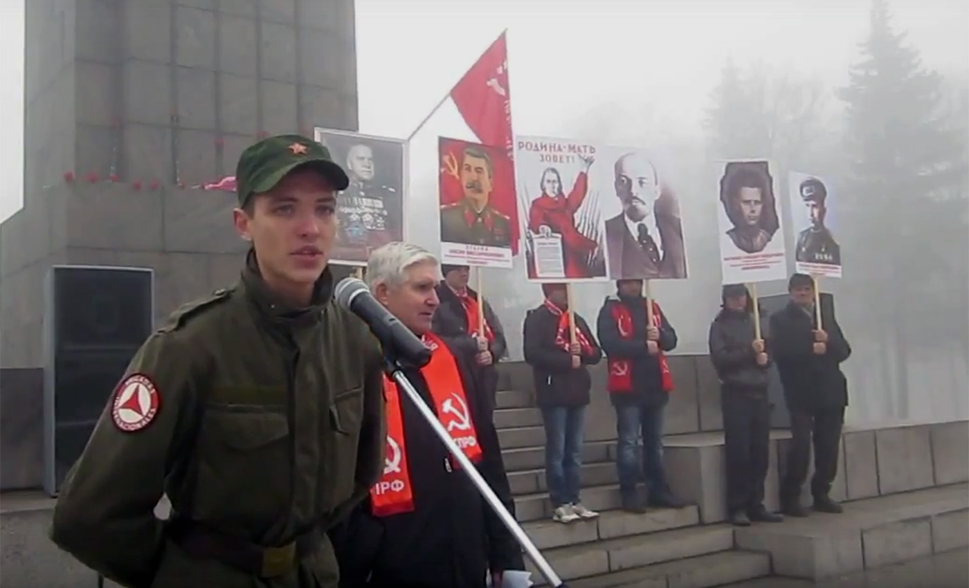 7 ноября 2014 года в Ульяновске проходил другой митинг — члены местного отделения КПРФ возлагали цветы к памятнику Ленину в честь 97-й годовщины Октябрьской революции. После лидеров местного отделения партии, депутатов заксобрания и постоянного участника всех митингов КПРФ в Ульяновске Виктора Гуся (он поднялся на сцену с родившимся месяц назад сыном, названным в честь руководителя ГДР Вальтера Ульбрихта) к микрофону вышел молодой человек в похожем на военную униформу костюме оливкового цвета.