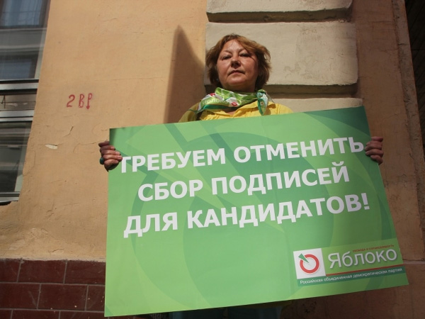 Пикет против сбора подписей \ yabloko.ru На выборах в заксобрания отсев среди кандидатов от партий, не имевших льготу, — 86%, у самовыдвиженцев — 63%. Иногда решения региональных избиркомов были настолько необоснованными, что ЦИКу пришлось приходить на помощь партиям и восстанавливать регистрацию — «Яблоко» в Новгородской области, ПАРНАС, «Коммунисты России» и «РОТ-Фронт» в Санкт-Петербурге.