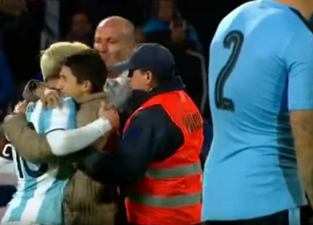 Болельщик выбежал на поле и поцеловал ногу Месси во время матча Аргентина–Уругвай