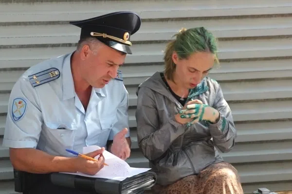 Когда Диана Хачатрян попыталась снять Лену и следы зеленки на ее одежде и лице, другой молодой человек в майке «Антитеррор» ударил Диану по голове, отобрал телефон и не спеша ушел. Полицейские и тут не сделали попытки задержать человека и предотвратить хулиганские действия.