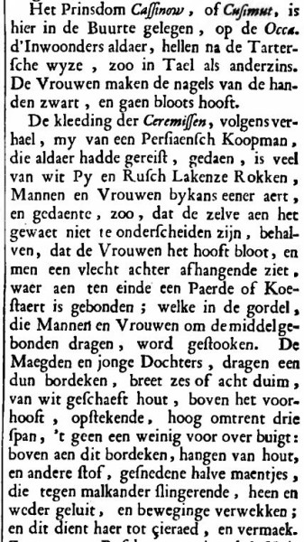 "Княжество Кассимов лежит здесь, по соседству, на Оке. Жители там склоняются к тартарским обычаям как в языке, так и в остальном. Женщины красят ногти на руках в черный цвет и ходят с непокрытой головой".