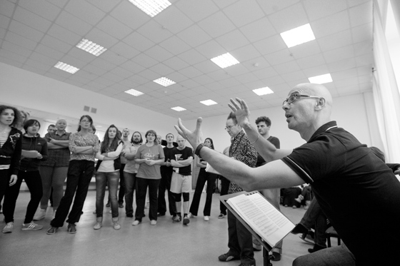 Рене Якобс Это происходит так. Йохан дает им задание. Объясняет примерно пять минут. Потом ребята собираются вместе, распределяют, кто что делает… через десять минут сцена готова! Для оперного режиссера такой хор — просто подарок. Обычно это огромная и длительная работа — превратить хор из безликой серой массы в набор индивидуальностей. Но этот хор на 40 человек… каждый из них — уже индивидуальность.