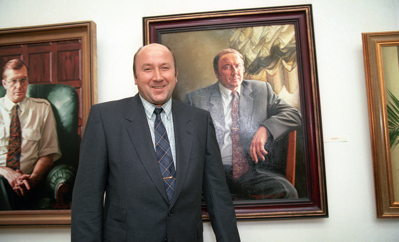 Александр Коржаков на фоне своего портрета работы художника Сергея Присекина, 1998 год. Фото Виктора Великжанина / ТАСС
