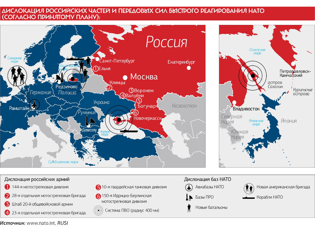 В ситуации новой Холодной войны Россия и Запад живут уже два месяца — ровно столько времени прошло после варшавского саммита НАТО (8–9 июля 2016 года), на котором приняты решения, определяющие параметры военного противостояния сторон. В 2017 году в трех балтийских государствах и Польше будут размещены многонациональные батальонные тактические группы, численностью до 1 тыс. военнослужащих каждая. В Польше костяк батальонов составят американцы, в Латвии — канадцы, в Эстонии — британцы, в Литве — немцы. Кроме того, президент США пообещал: в Европе «на ротационной основе» будет размещена американская бригада (еще 4 тыс. военнослужащих), и ее вооружение будет заблаговременно складировано — судя по всему, в ФРГ. В Румынии НАТО создаст еще одну многонациональную бригаду с болгарским участием. Кроме того, численность сил быстрого развертывания НАТО утроена и составляет сейчас 40 тыс. военнослужащих. Вдобавок к этому будут готовы развернуться в районе потенциального конфликта в течение 72 часов и «силы самой высокой готовности» численностью свыше 5 тыс. солдат. В сумме получается внушительно — со всех точек зрения.