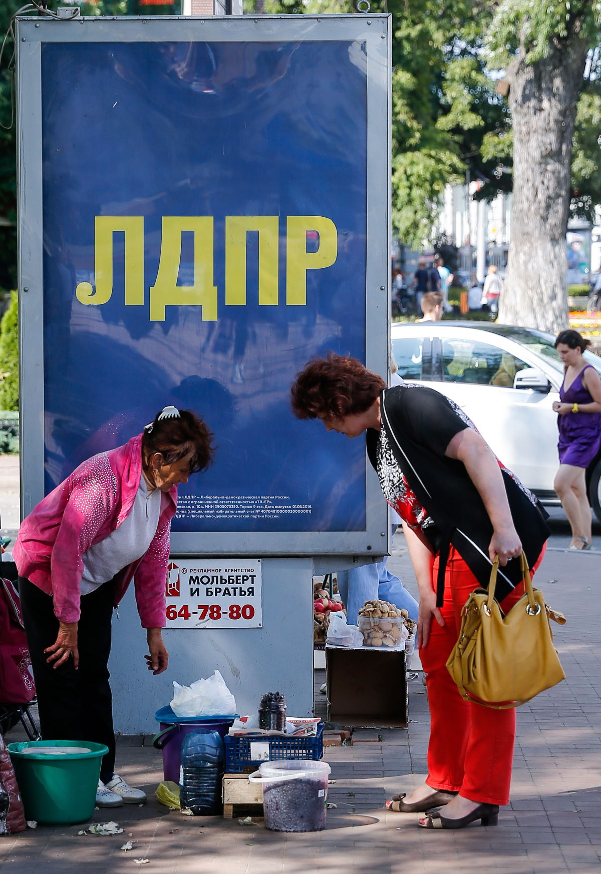 На билбордах ЛДПР главными всегда были четыре желтые буквы на голубом фоне. Такая агитация с улиц и дорог в регионах никогда не пропадала. Нововведением к выборам стали картинки на электронных экранах. «Соколы Жириновского» предлагают «вернуть границы СССР», а минимальную заработную плату установить в размере 20 тыс. рублей. Собственно, для агитации ЛДПР много и не надо — показать по ТВ Владимира Жириновского, который разнесет всех и вся. Не забыла партия и про свой классический лозунг — «Мы за бедных, мы за русских», его модифицировали: «Хватит унижать русских».