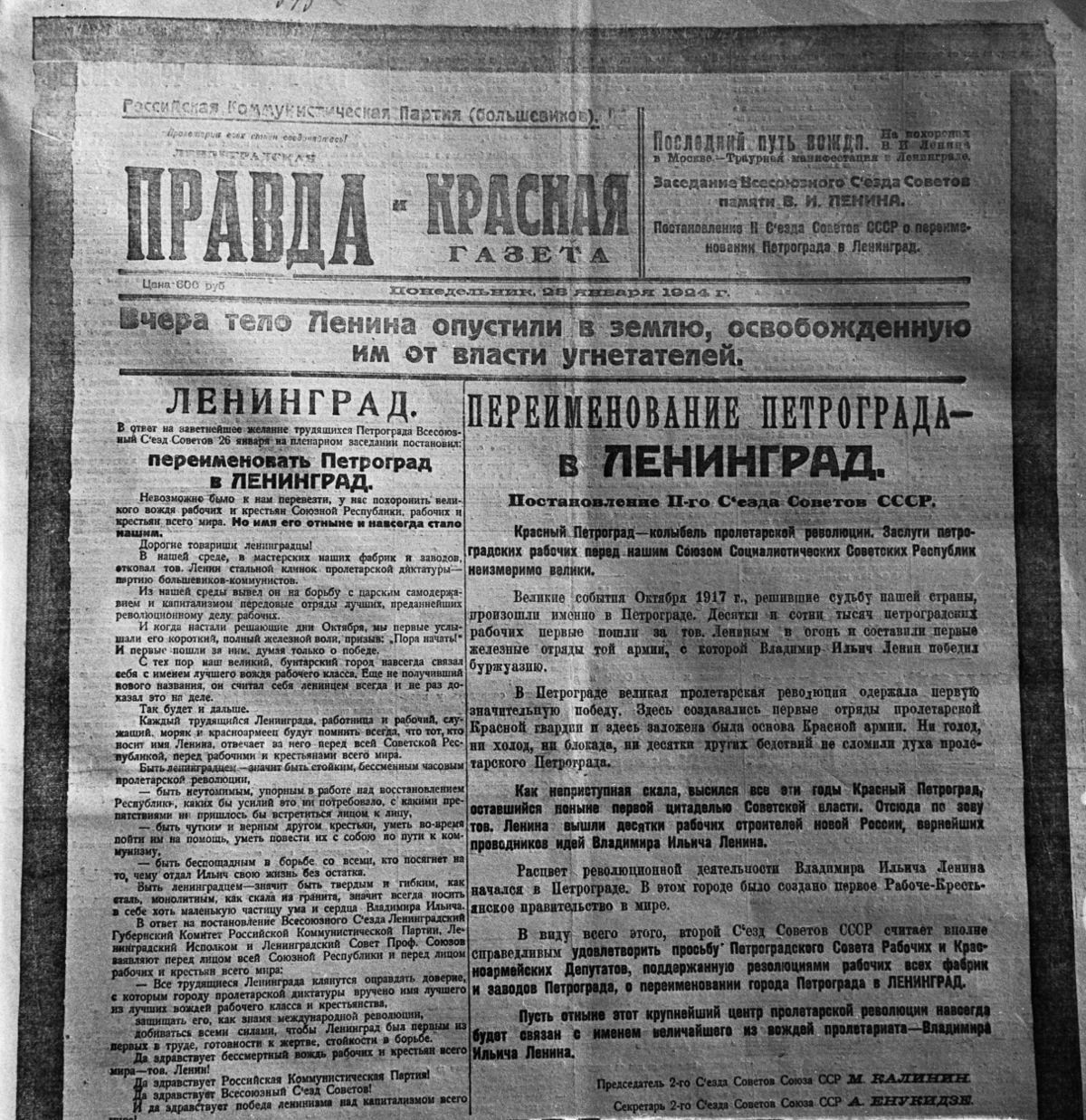 По свидетельству художника Кузьмы Петрова-Водкина, призванного тогда запечатлеть Ленина в гробу, «вожди» признавались ему: смерть Ильича повергла их в такое отчаяние, что посоветуй тогда ознаменовать его смерть снесением всей Москвы, то и это было бы принято. Напрасно ездил в Москву академик Сергей Ольденбург, лично знавший покойного: от имени Академии наук он пытался вразумить партийное руководство и отменить необдуманное постановление о переименовании Петрограда. Не увенчалась успехом и попытка депутации от общества «Старый Петербург» с письмом самого Ленина, написанным за два-три года до смерти в ответ на петицию «Старого Петербурга», уже тогда всполошенного слухами о грядущем переименовании города. Вождь мирового пролетариата в письме заверял, что никогда не допустит, чтобы посягнули на имя, данное городу «первым русским революционером», имея в виду царя Петра I. Но соратники проигнорировали и этот документ.