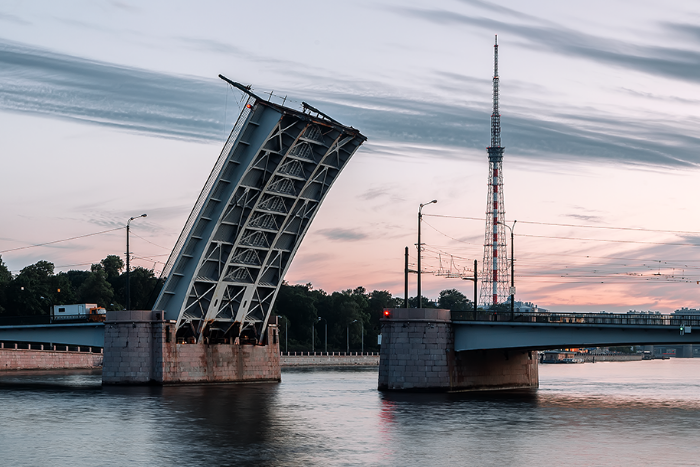 сообщает пресс-служба КРТИ. Как уточнили в ведомстве, это связано с работами по гидромониторной очистке опор и конструкций разводных пролетов моста. Остальные мосты по Большой и Малой Неве разводятся по графику.