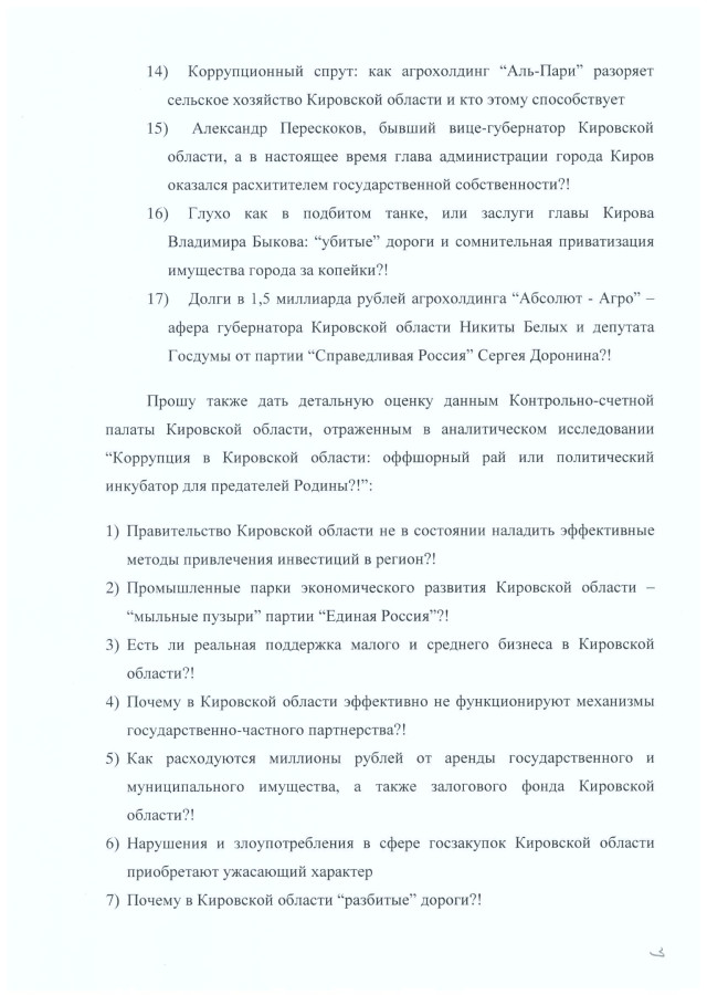 Кроме того я попросил предоставить детальную оценку данным Контрольно-счетной палаты Кировской области, отраженным в аналитическом исследовании “Коррупция в Кировской области: оффшорный рай или политический инкубатор для предателей Родины?!”:
