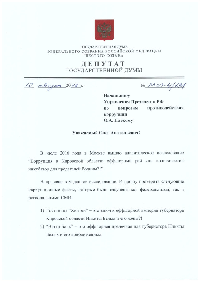 В августе 2016 года я направил запрос и аналитическое исследование “Коррупция в Кировской области: оффшорный рай или политический инкубатор для предателей Родины?!” начальнику Управления Президента России по вопросам противодействия коррупции Олегу Плохому.