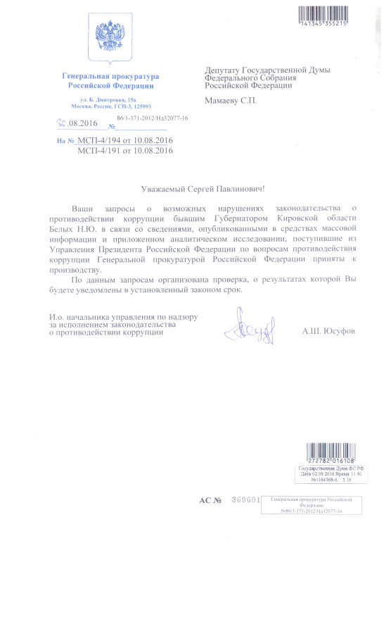 В сентябре 2016 года мне поступил официальный ответ от и.о. начальника управления по надзору за исполнением законодательства о противодействии коррупции Генеральной прокуратуры А.Ш. Юсуфова.