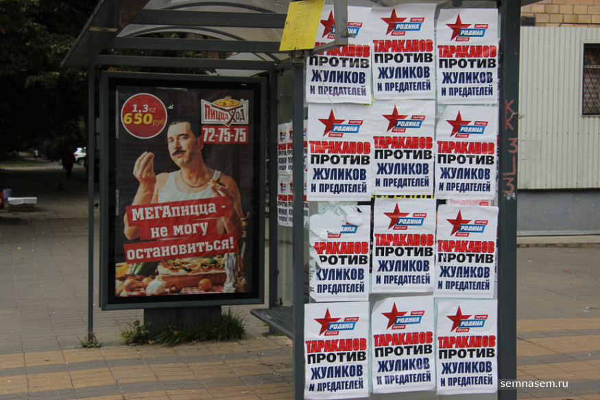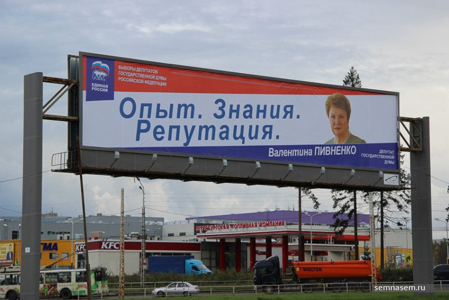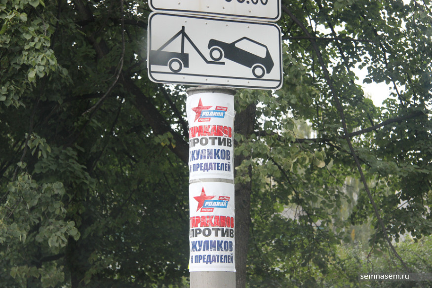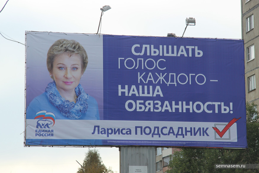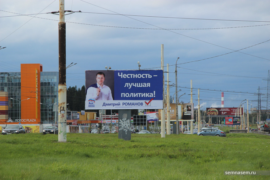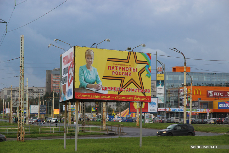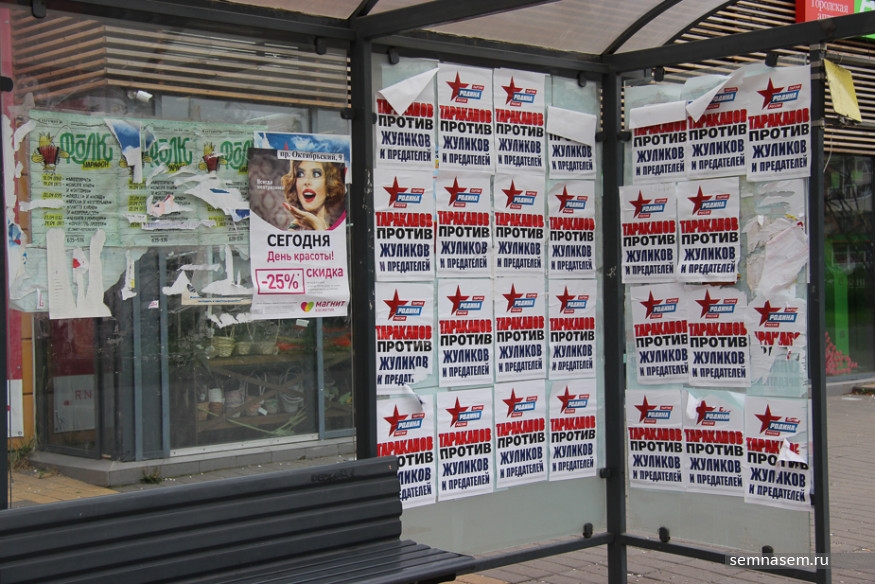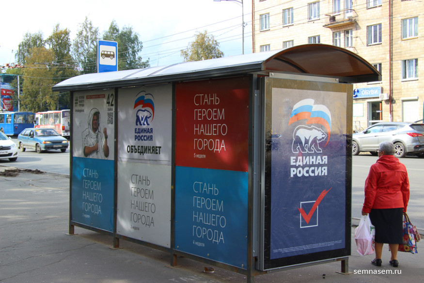 Корреспондентам «7x7» не удалось обнаружить рекламы КПРФ, «РОТ Фронта», Партии Роста и «Гражданской платформы», чьи кандидаты претендуют на места в парламентах разных уровней. Единственный плакат, который мы нашли на въезде в город — принадлежит партии «Патриоты России». С остальными непонятно — то ли скуден их партийный бюджет, то ли такова задумка пиарщиков.
