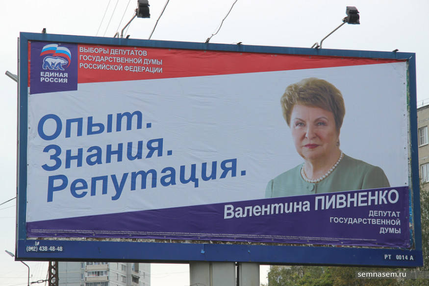 Не пожалела денег на красивые плакаты и кандидат в депутаты Госдумы от «Единой России» Валентина Пивненко. Ее изображения «украсили» самые большие баннеры в городе.