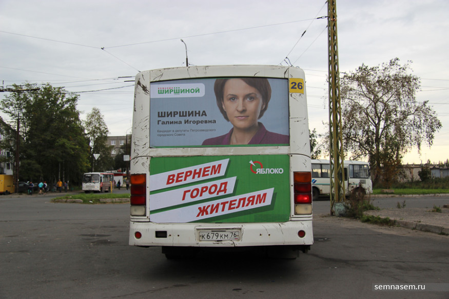 Партия «Яблоко» сделала ставку на экс-мэра Петрозаводска Галину Ширшину. В отличие от других «команд» партия «Яблоко» персонифицирована «брендом» Ширшиной. Обращает на себя внимание троеточие над буквой Ш: вероятно, это стилизация под корону. Станет ли Ширшина королевой Петросовета? На этот вопрос сначала ответит Верховный суд Карелии, а затем, если список «Яблока» допустят до выборов, избиратели. А пока изображение Галины Ширшиной разъезжает по городу на ПАЗиках.