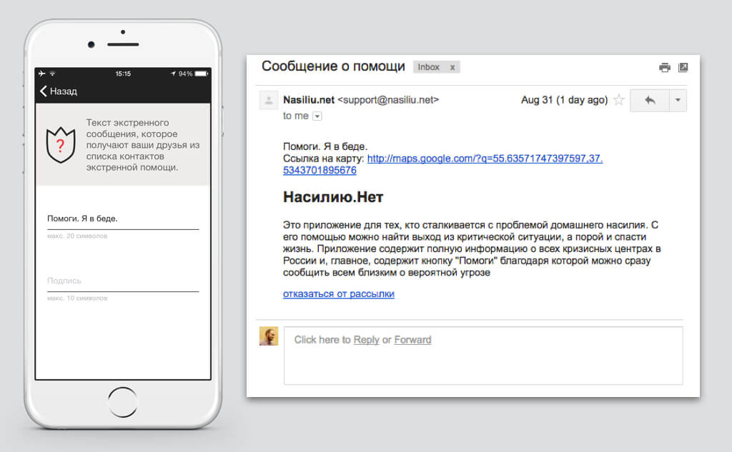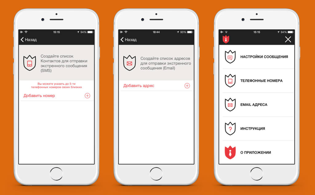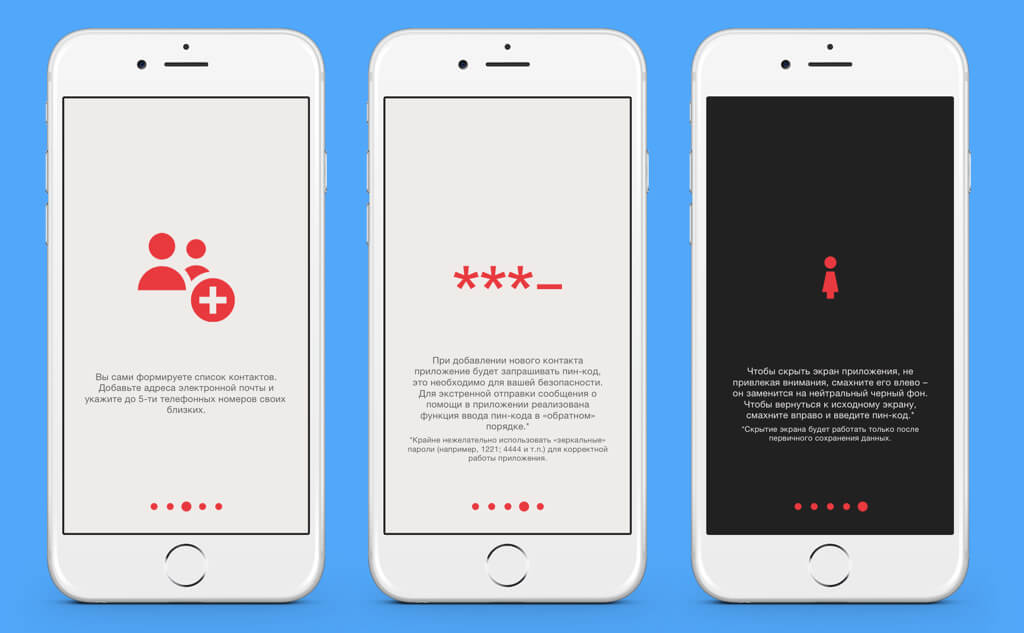 «Насилию.нет» помогает сформировать список телефонов близких людей и адресов электронной почты, которые получат сообщение в случае нажатия на кнопку помощи. Кнопка защищена от случайного нажатия и сообщения не отправляются в первые три секунды, поэтому есть возможность отменить вызов помощи.