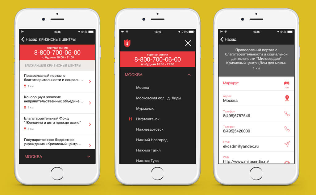 Приложение решает эту проблему, предоставляя все необходимые контакты, а также автоматически выстраивает маршрут до ближайшего кризисного центра. Эта информация актуальна и для тех, чьи близкие сталкиваются с проблемой домашнего насилия, так как специалисты кризисных центров могут подсказать родственникам и друзьям пережившей насилие, как лучше вести себя в том или ином случае.
