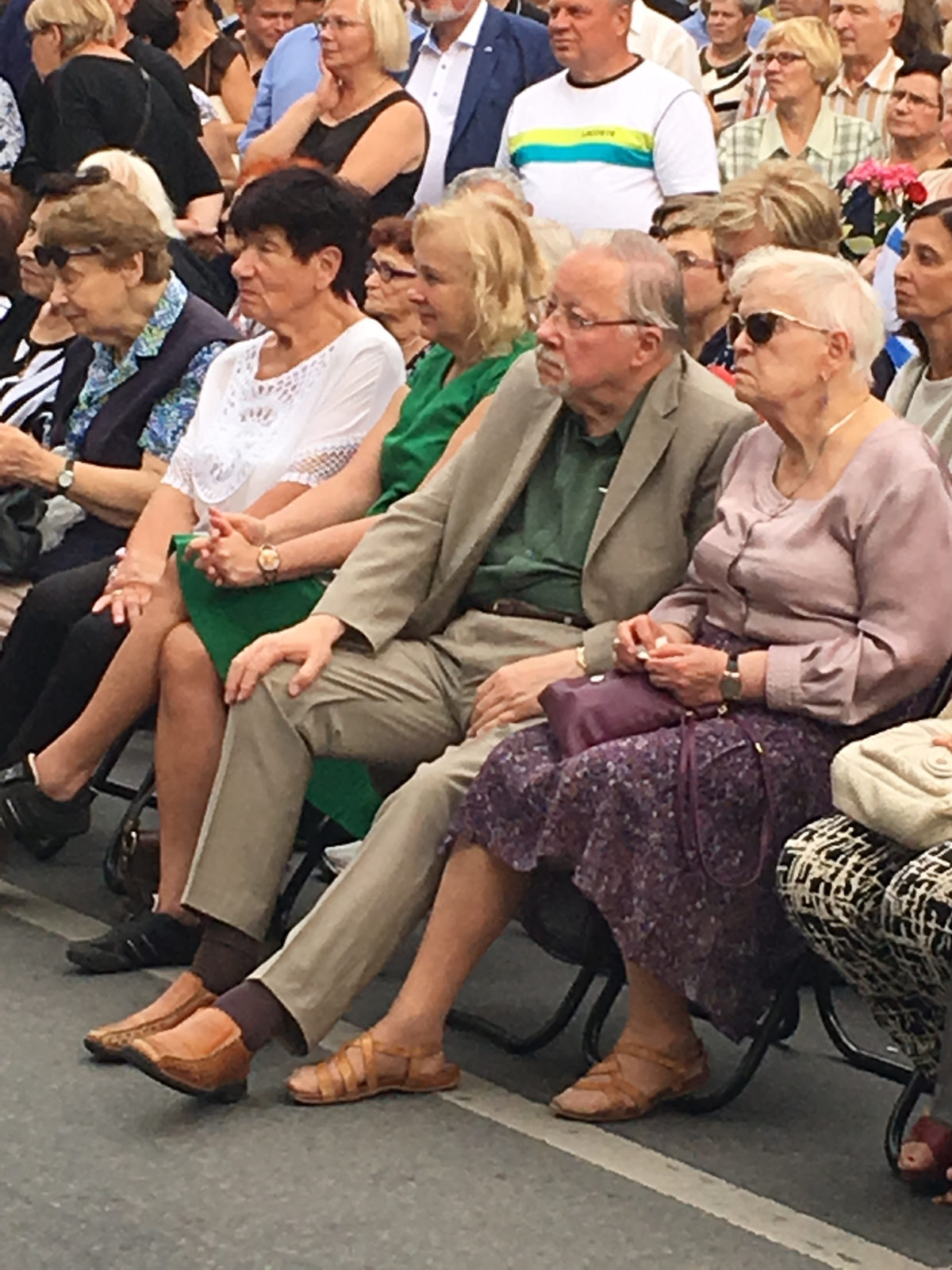 Премьер-министр тоже не приехал, зато министр обороны Юозас Олекас шел вместе со всеми в середине колонны, собравшей никак не меньше трех тысяч человек. Его адъютант нес корзину с цветами — министр потом возложил ее к памятнику. Приехал и первый глава независимой Литвы, политик консервативного толка Витаутас Ландсбергис — он сидел вместе с супругой в первом ряду во время короткого митинга перед началом марша. Был здесь и его внук, Габриэль, лидер «Союза Отечества» — одной из четырех основных партий Литвы. По словам Марюса, в Молетай приехали все известные медиаперсонажи страны: один из его друзей сначала заказал два автобуса из Вильнюса — они быстро заполнились, он заказал и третий: «Интеллектуальная элита Литвы — она вся была здесь», — сказал мне Ивашкявичус. Немало в колонне было и молодых людей — из разных городов страны, с портретами убитых и праведников. Были и местные: бывшие учительницы Наталья и Альма, например, несли портреты Адины и Мойши Шахот, убитых 75 лет назад. На вопрос, что их привело на этот марш, ответили: «Мы против убийства». Ну и конечно, приехали литваки* из разных стран мира: из Южной Америки, Австралии, Израиля, России, Сара из Москвы, которую в детстве вынесли в мешке из Каунасского гетто, Ноэми (Нетта) — ныне из Петах-Тиква, жизнь прожившая в Шауляе, братья из Хайфы, пара из Клайпеды, сотни других — осколки культуры, навсегда уничтоженной в этой части Европы. В этот день 75 лет назад в Молетае было убито 700 взрослых и 1469 детей.
