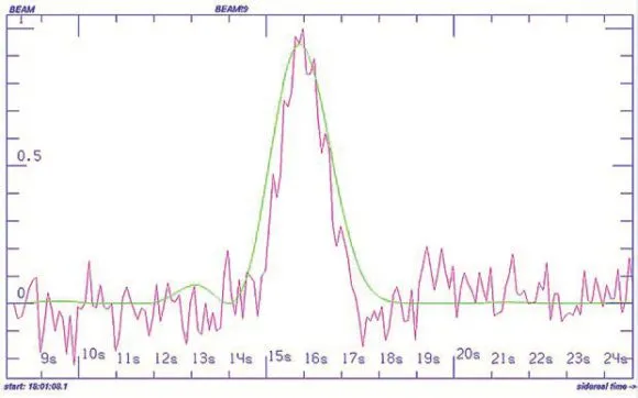 Отклик имеет форму, близкую к гауссиане, соответствующую диаграмме направленности антенны на этой длине волны с наложенной шум-дорожкой.