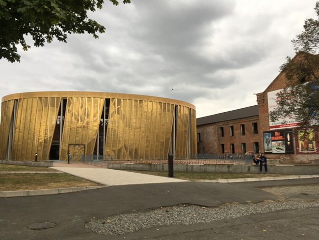 Фото: Илья Азар / «Медуза» Здание спортзала, в котором держали заложников, теперь превращено в мемориал по погибшим; вокруг него построен золотой саркофаг. Беслан, 4 сентября 2016 года