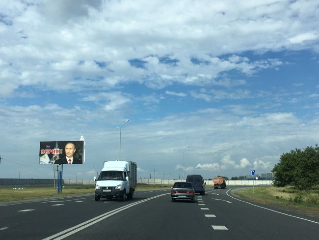 Со столицей Северной Осетии Владикавказом Беслан соединяет одна дорога. На въезде в город рядом с ней размещены сразу два плаката с изображением Владимира Путина. На одном написано: «Гордимся страной — гордимся президентом». На втором — «Верим».