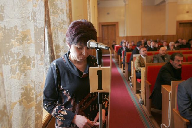 Фото: Валерий Мельников / «Коммерсантъ» Одна из представительниц комитета «Голос Беслана», Элла Кесаева, на представлении доклада комиссии парламента Северной Осетии по расследованию теракта, 29 ноября 2005 года