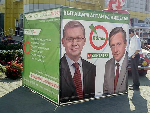 Предвыборная агитация "Яблока" на Алтае. Август 2016. Фото: Facebook Владимира Рыжкова Также удалось договориться с «Парнасом» — «Яблоко», например, отказалось от выставления кандидатуры в центре Москвы, «уступив» округ Андрею Зубову. У того, правда, появился конкурент в лице Марии Бароновой, так что в итоге в одном из самых оппозиционно настроенных округов Москвы может победить кандидат от «Единой России» Николай Гончар, но это уже не проблема «Яблока».