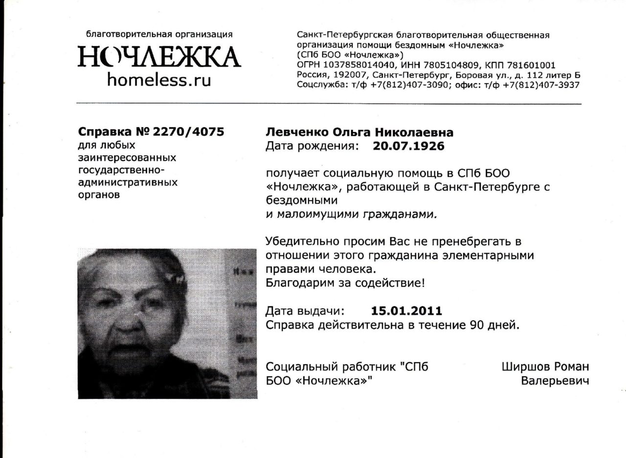 Справка «Ночлежки» для Ольги Николаевны Впрочем, и российской пенсии тоже не было, ее выплачивала Украина. Ольга Николаевна купила там у знакомых домик, чтобы зарегистрироваться и получать пенсию хотя бы в другой стране. Жить в нем было невозможно, продать тоже, поскольку он был признан аварийным.