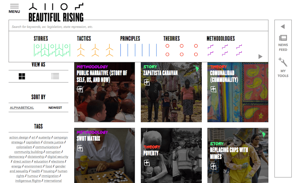 В отличие от воздушных шаров, Beautiful Rising добрался далеко за пределы Уганды. Состоящая из общественных организаций, тренеров, технических гуру и писателей, команда проекта работает по всему миру и расширяет библиотеку ресурсов для реализации социальных изменений с использованием технологий и Интернета. Акцент инструментов сделан на удобстве использования активистами, безопасности и доступности.