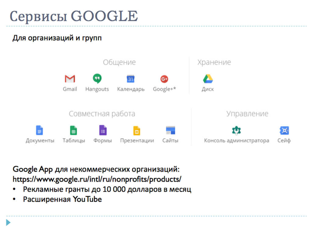 Самая известная компания, предоставляющая бесплатные облачные сервисы, – Google. На их основе организация может не только обеспечить хранение и совместную работу с файлами, но и координировать деятельность сотрудников, легко обрабатывать информацию и даже проводить вебинары. Специальная программа «Google для некоммерческих организаций» позволяет использовать корпоративные возможности Google Apps бесплатно.