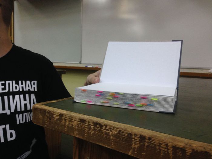 Тем временем в аудитории некоторые интересовались: «А сколько стоит книга?». После лекции те, кто заранее приобрели «Модицину», вереницей потянулись к Никите за автографом. Одна девушка протянула книжку. Помните фото, на которых в книгах из серии «Песнь Льда и Пламени», по которым снимали сериал «Игра Престолов», закладками обозначены смерти или, там, постельные сцены? Томик этой старательной читательницы производил похожий эффект.