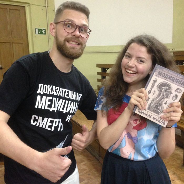 Никита Жуков пришёл на лекцию в футболке с надписью: «Доказательная медицина или смерть». Призвание Никиты, по его собственным словам, — разоблачать врачебное шарлатанство и учить граждан оставлять голову включённой при посещении докторов. В свободное от этой миссии время он врач-невролог частной практики, который шесть дней в неделю занимается тем, что следует данной им клятве Гиппократа.