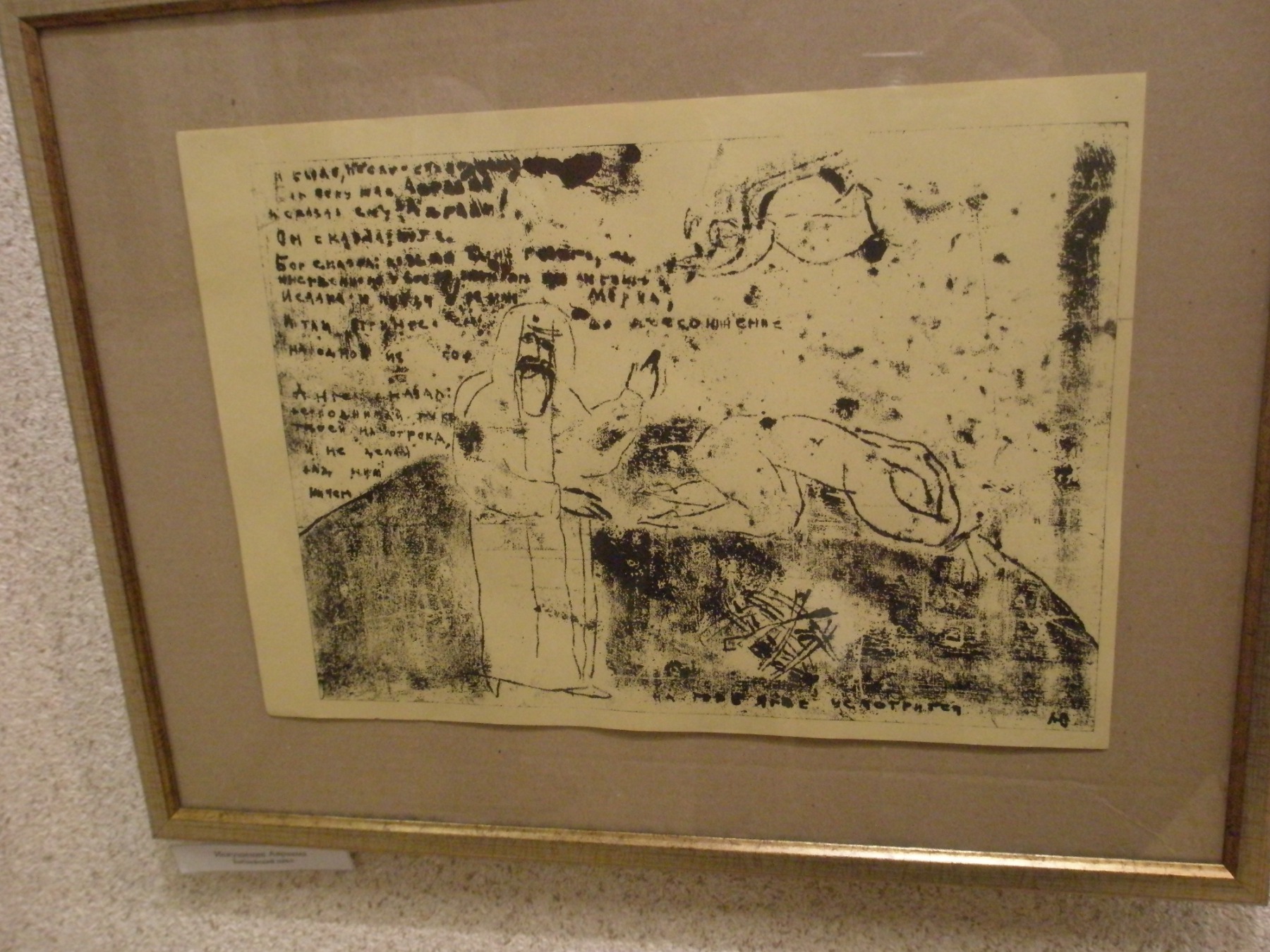 Когда люди заходили в небольшой галерейный зал, то невольно сворачивали в левую его часть — туда, где висели яркие жизнерадостные работы Елены Юдиной: «Сиреневая улица», «Никольская церковь», «Ананасы в шампанском»… Я к ним подошёл в последнюю очередь, надолго задержавшись возле лаконичного чёрно-белого «Библейского цикла». Эти работы занимали правую часть зала. «Иосиф и его братья», «Борьба Иакова с ангелом», «Искушении Аврама», «Две серебряные трубы», «Лестница в небо (Сон Иакова)»… Этот графический цикл сделан так, будто рисунки проступают прямо на стене. Краски выгорели или их «съело» время, но осталось главное. Особенно очевидно это в контрасте с противоположной цветной стеной.