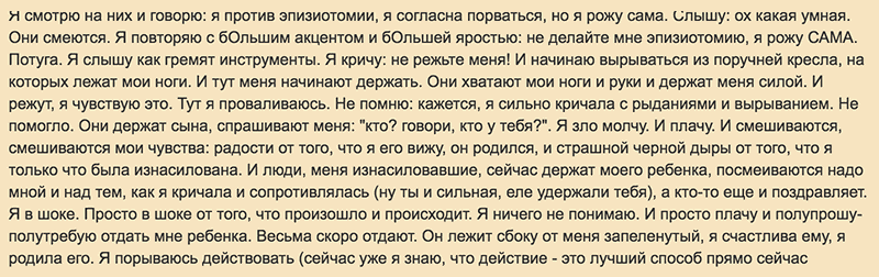 Вот, например, душещипательная эмоциональная история, в которой доула делится своим опытом родов в роддоме, называя их изнасилованием: