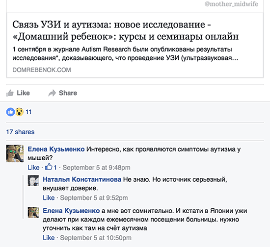 Конечно очень легко смеяться над женщин, которые видят связь между УЗИ и аутизмом, скажете вы, но к естественным родам приходят не только по глупости. В наших роддомах действительно часто происходит странное. В основном, конечно, это обычное разгильдяйство, устаревшие протоколы, отставание от мировых тенденций на несколько лет (как минимум потому, что мало кто за пределами МКАДа и аналогичных ему границ в достаточной степени владеет английским языком), мало кто из персонала искренне озабочен отношениями врач-пациент. У работников роддомов большая нагрузка, низкие зарплаты и прочее. В общем, это совсем не то, чего ждёт женщина на сносях.