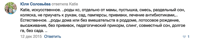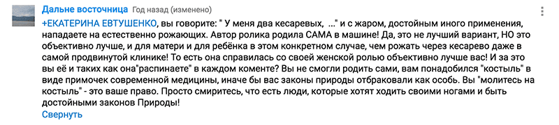 Где-то между первыми и вторыми находятся женщины, которые рожали естественно, но с медицинским вмешательством — прокололи пузырь, стимулировали ламинариями, капали окситоцин. Если в правильном ключе рассказать свою историю об этом, тебя ещё могут пожалеть и почти не будут гнобить. Главное — это грубо утрировать, добавлять жутких подробностей и утверждать, что всё происходило не по вашей воле: «Это было как изнасилование, врач загнал меня на кресло и, не спросив, просто проколол пузырь, я плакала и вырывалась, но они связали меня и грубо велели заткнуться», — после таких историй ваш рейтинг в сообществе определённо подрастёт.